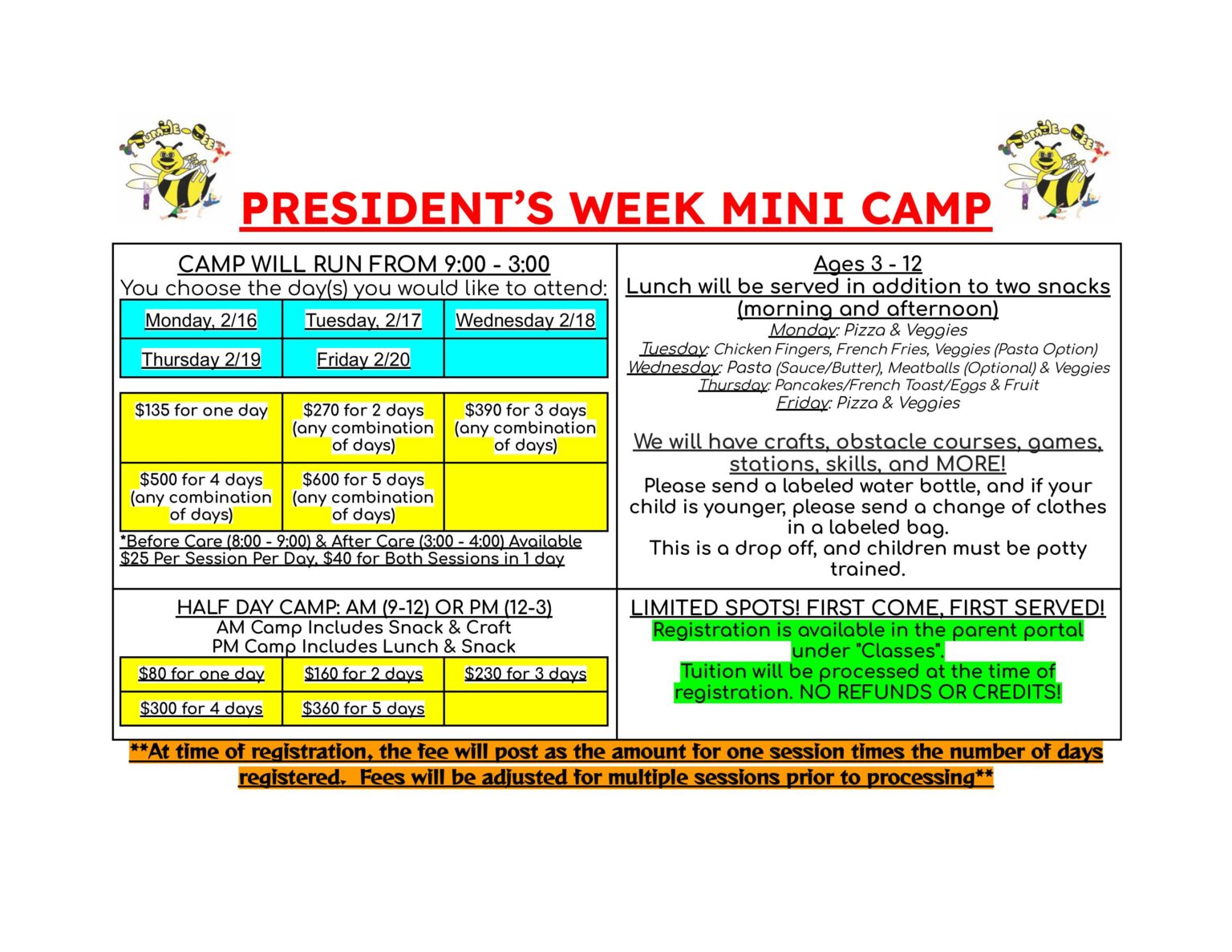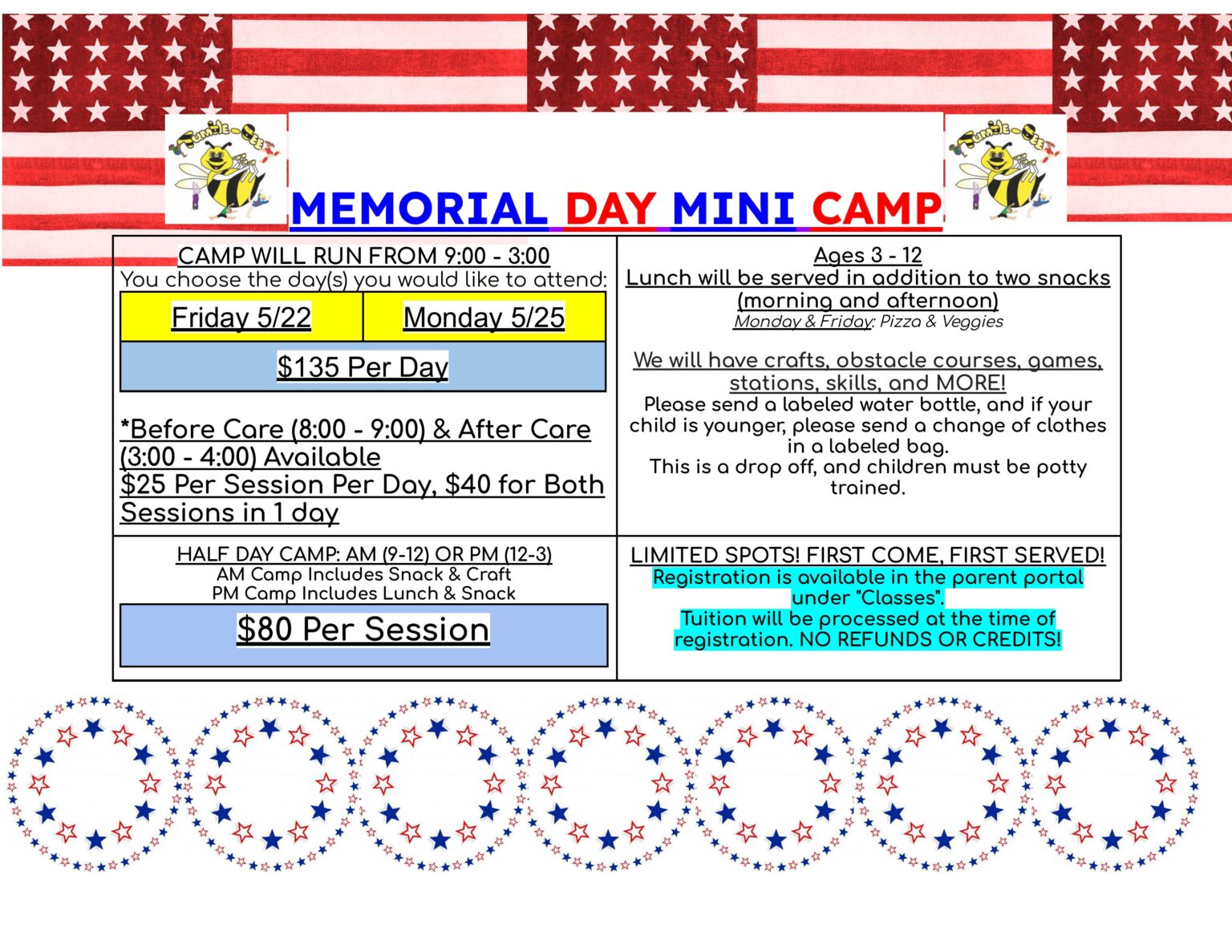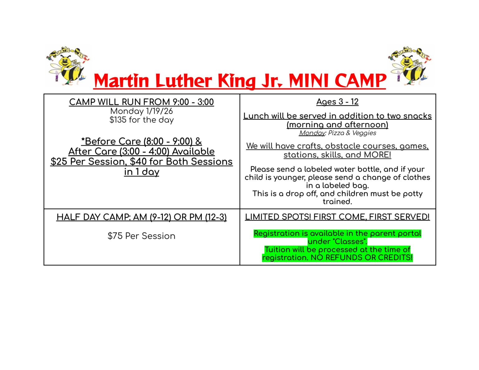 After Care will be offered from 3:00pm – 4:00pm each day that camp takes place. There will be optional additional snack offered. After care is $25 per day. (If you do both before and after care, the total cost will be $40 for the day)