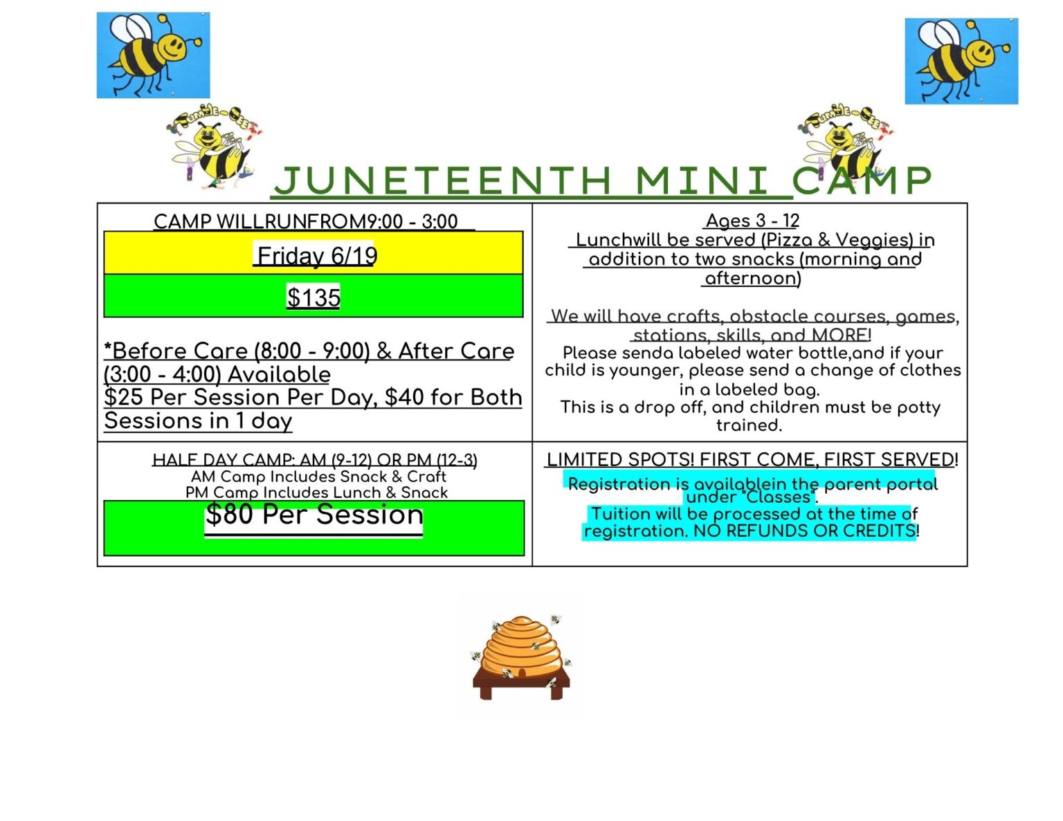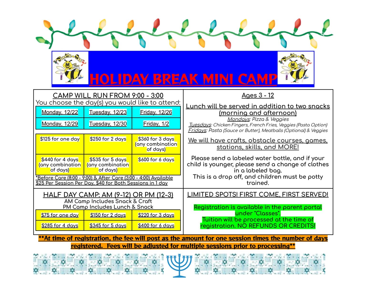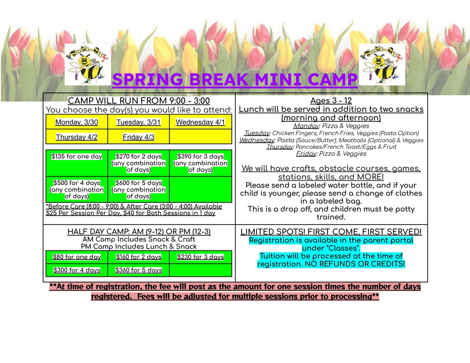 After Care will be offered from 3:00pm – 4:00pm each day that camp takes place. There will be optional additional snack offered. After care is $25 per day. (If you do both before and after care, the total cost will be $40 for the day)