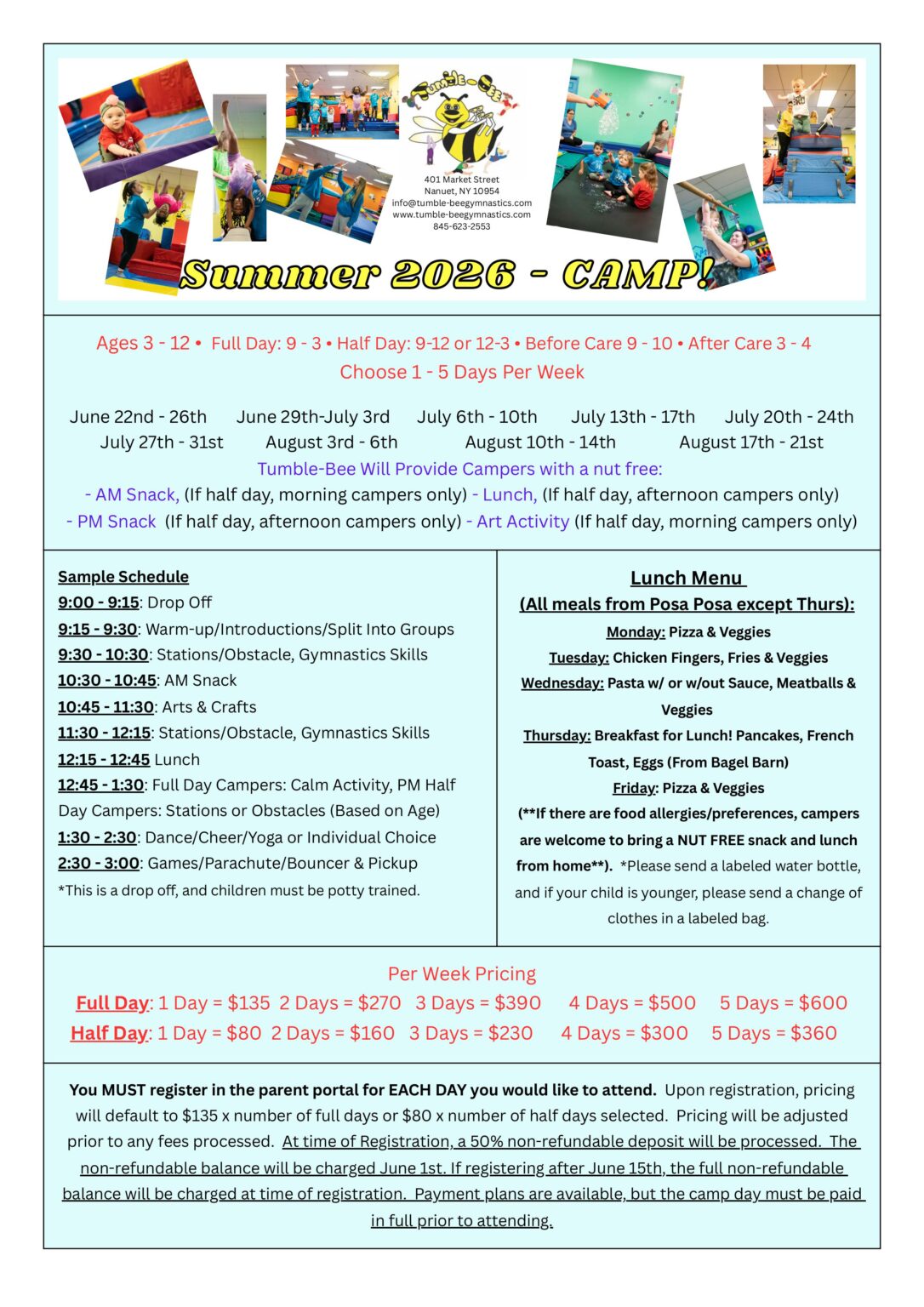 Before Care will be offered from 8:00am – 9:00am each day that camp takes place. There will be optional breakfast items including bagels, pancakes, waffles, french toast sticks, etc. Before care is $25 per day. (If you do both before and after care, the total cost will be $40 for the day)